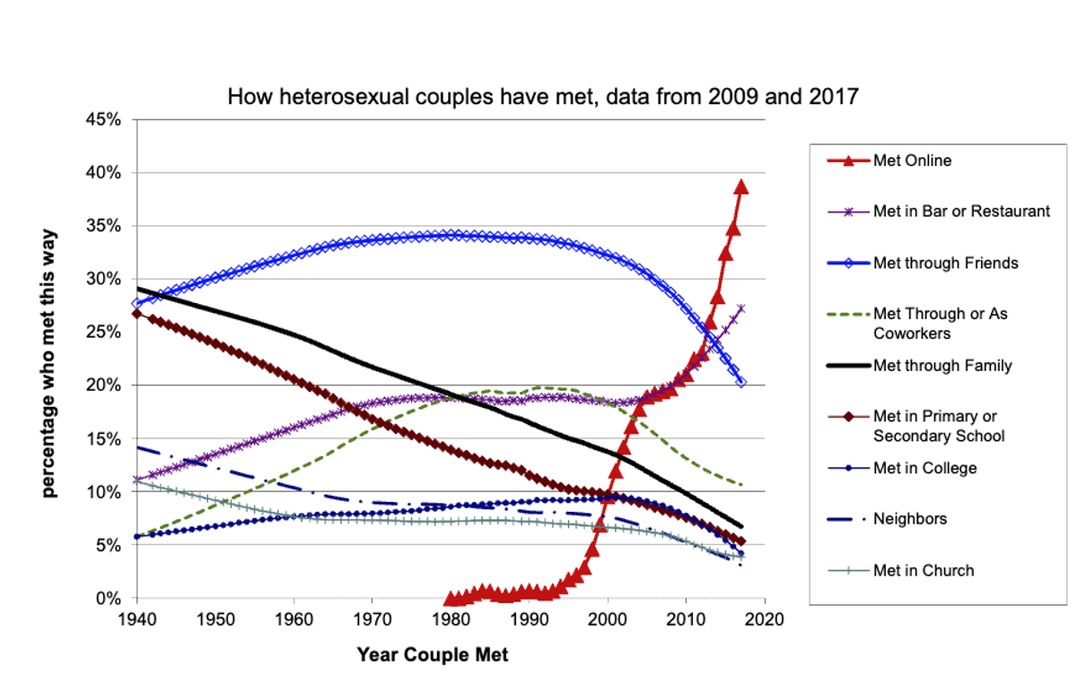 The advent of the Internet and the rise of smartphones have revolutionized the way people form relationships. Research by Rosenfeld et al. indicates that, since 2013, online dating has become the most common way for heterosexual couples in the US to meet, surpassing traditional methods such as introductions by friends.